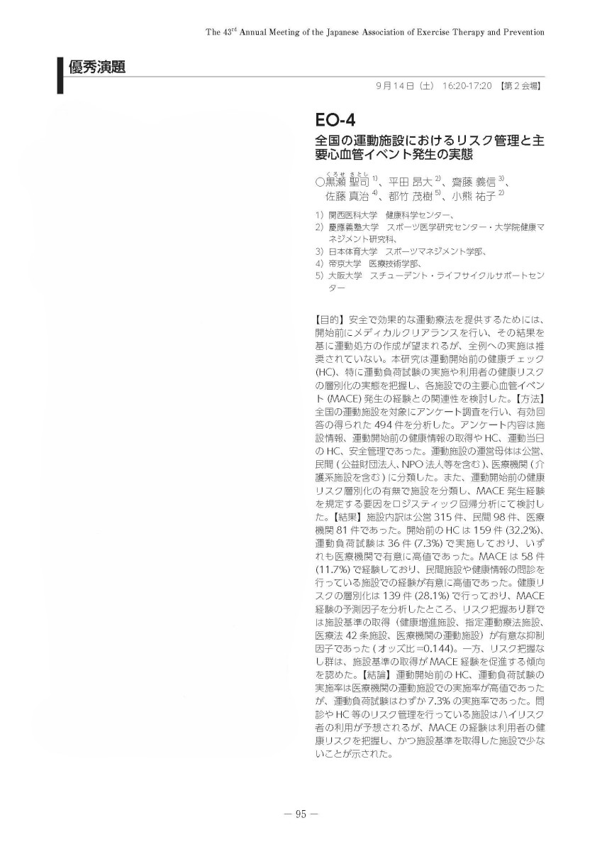 ○黒瀬聖司, 平田昂大, 齋藤義信, 佐藤真治, 都竹茂樹, 小熊祐子. 全国の運動施設におけるリスク管理と主要心血管イベント発生の実態.