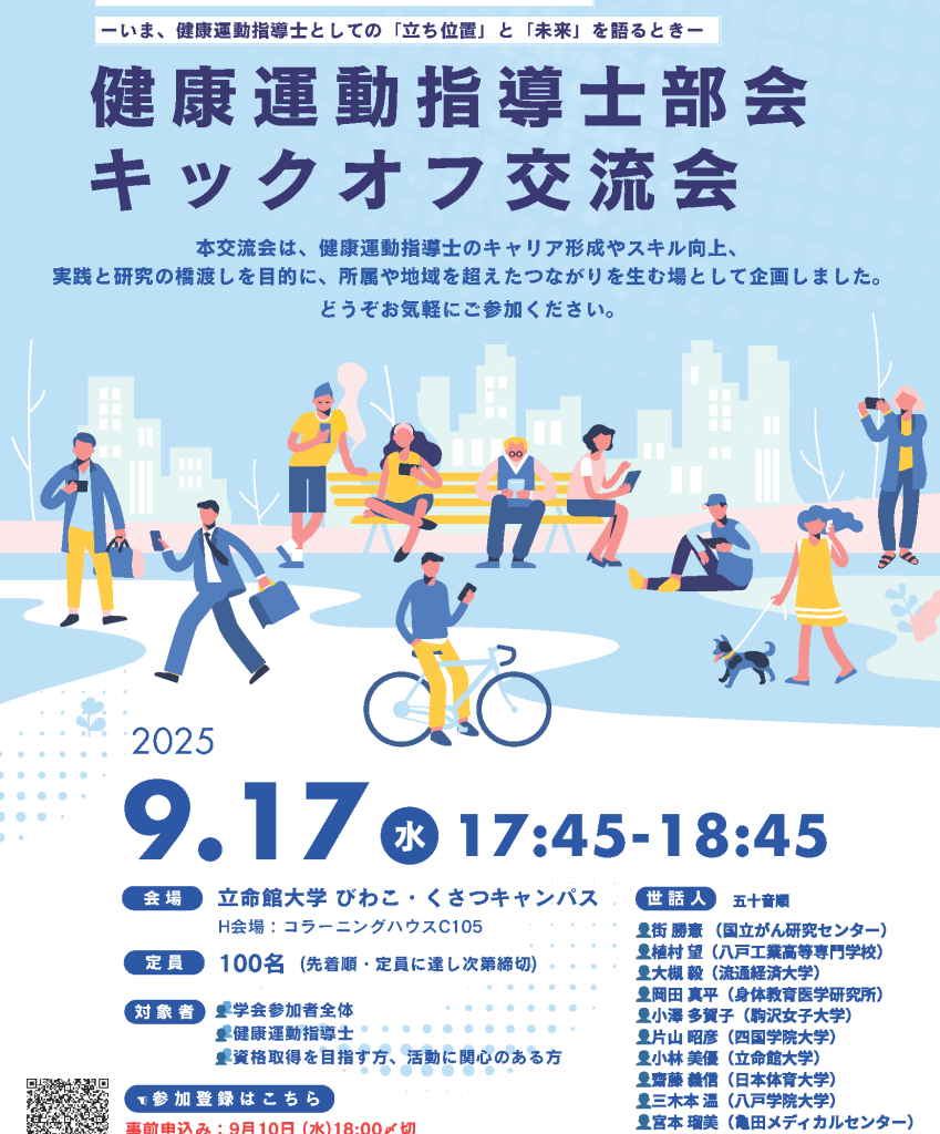 また健康運動指導士部会のキックオフ交流会も開催され、研究と実践現場の連携や指導士の養成・キャリアなどについて議論が行われました。
